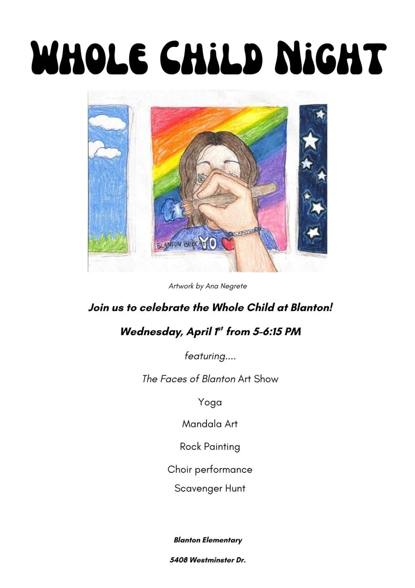 Whole Child Night will also feature the Faces of Blanton Art Show. Framed versions of student artwork in grades 1st-5th will be featured in the showcase and available for purchase.